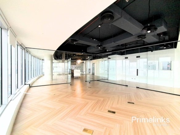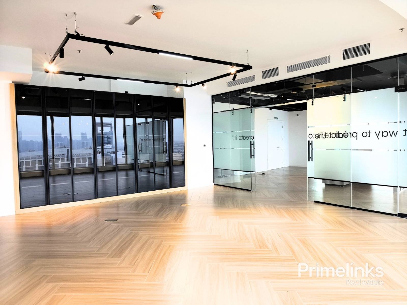 As showcased in the photos, the office is thoughtfully configured into three spacious private rooms, each enclosed with high-quality glass partitions featuring elegant frosted detailing. The layout is designed to maximize natural light while maintaining privacy and a professional atmosphere.Warm wood-finish flooring, clean architectural lines, and a modern ceiling with integrated lighting and AC vents enhance the executive appeal of the space.