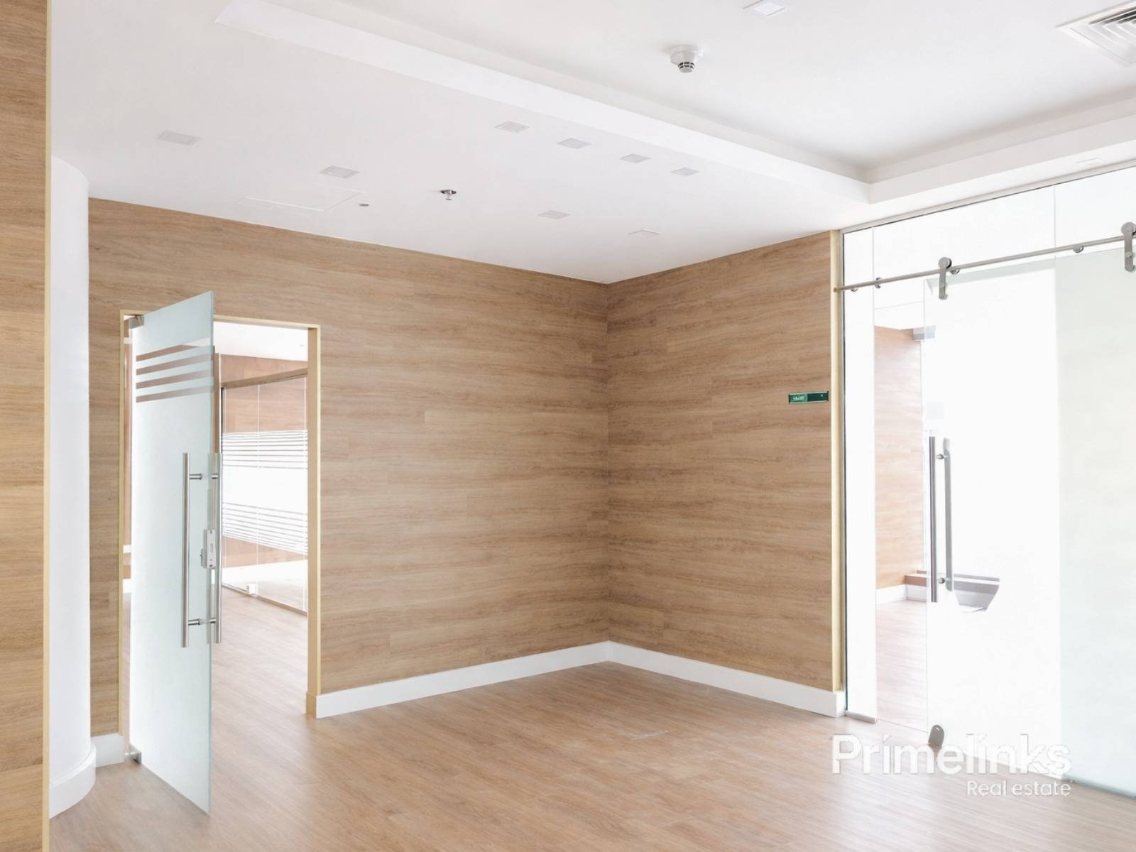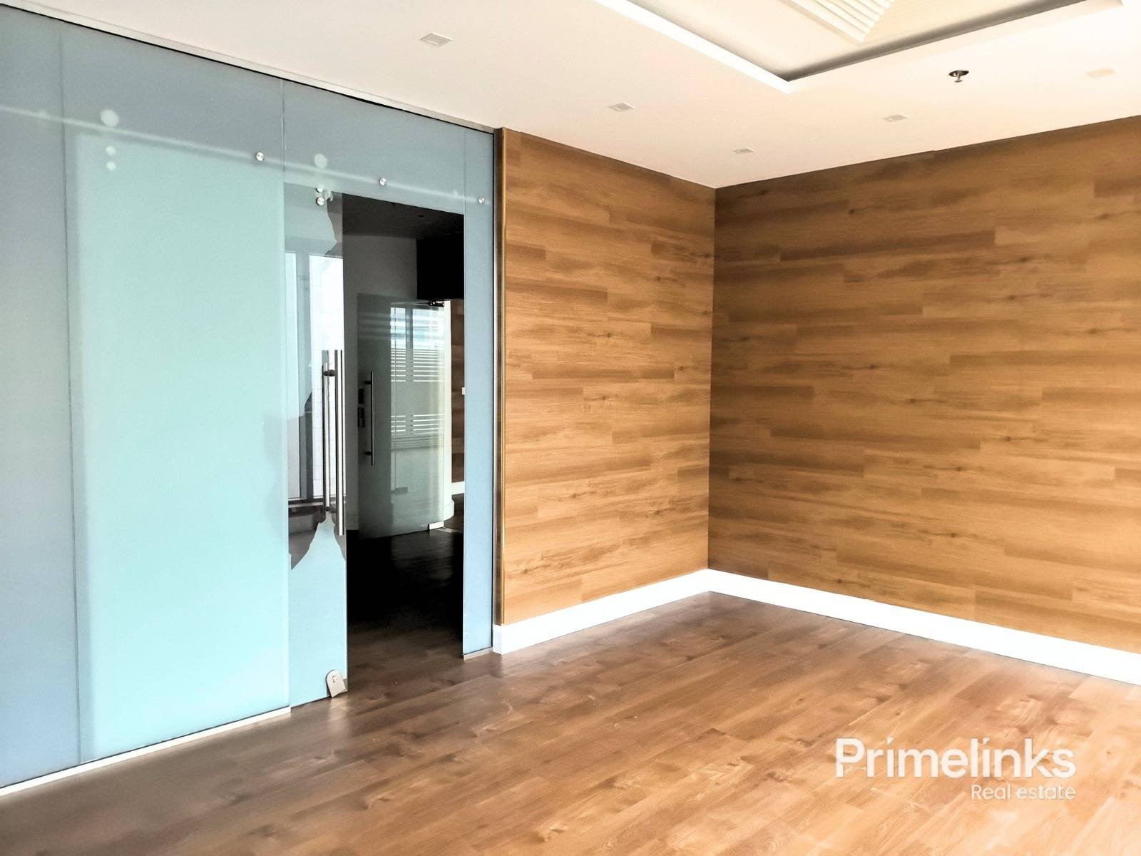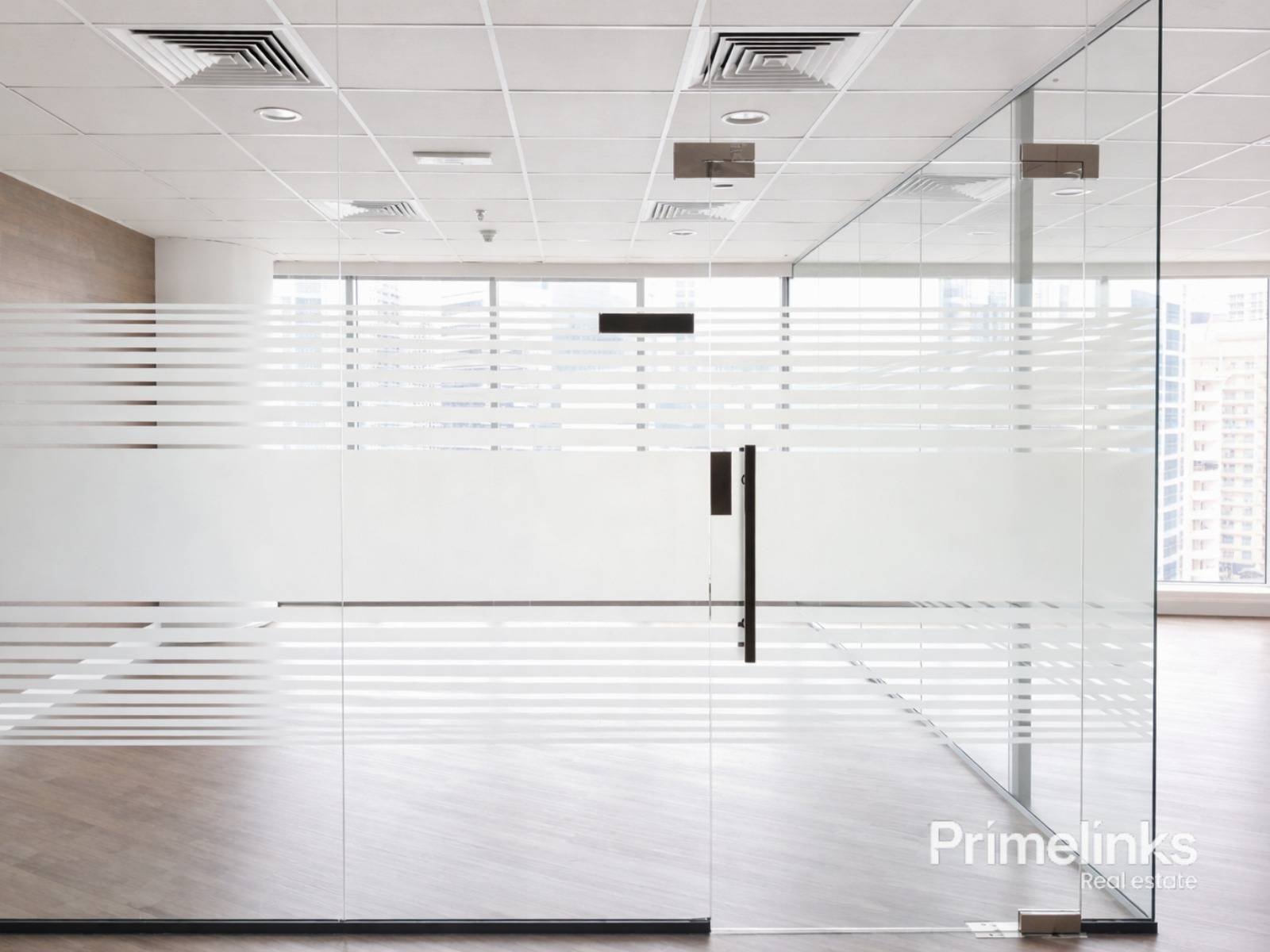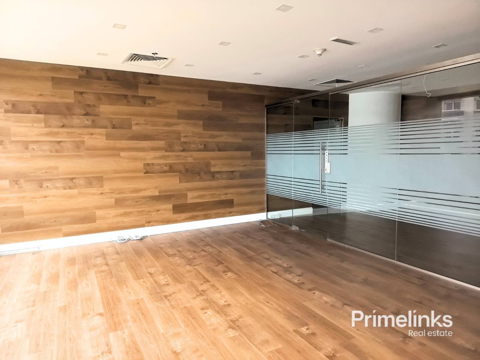 As showcased in the attached photos, the office is expertly configured into three private rooms, each defined by high-quality glass partitions with frosted detailing. The design maximizes natural light while ensuring discretion and professionalism. Warm wood-finish flooring, clean architectural lines, and a modern ceiling with integrated lighting and AC vents elevate the space with a sophisticated, executive feel.