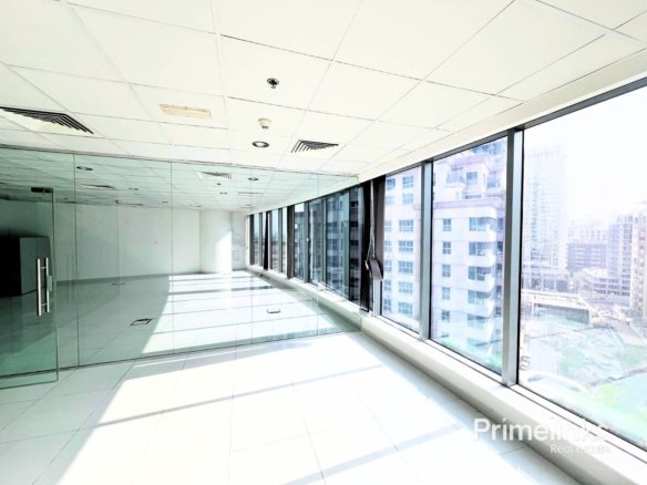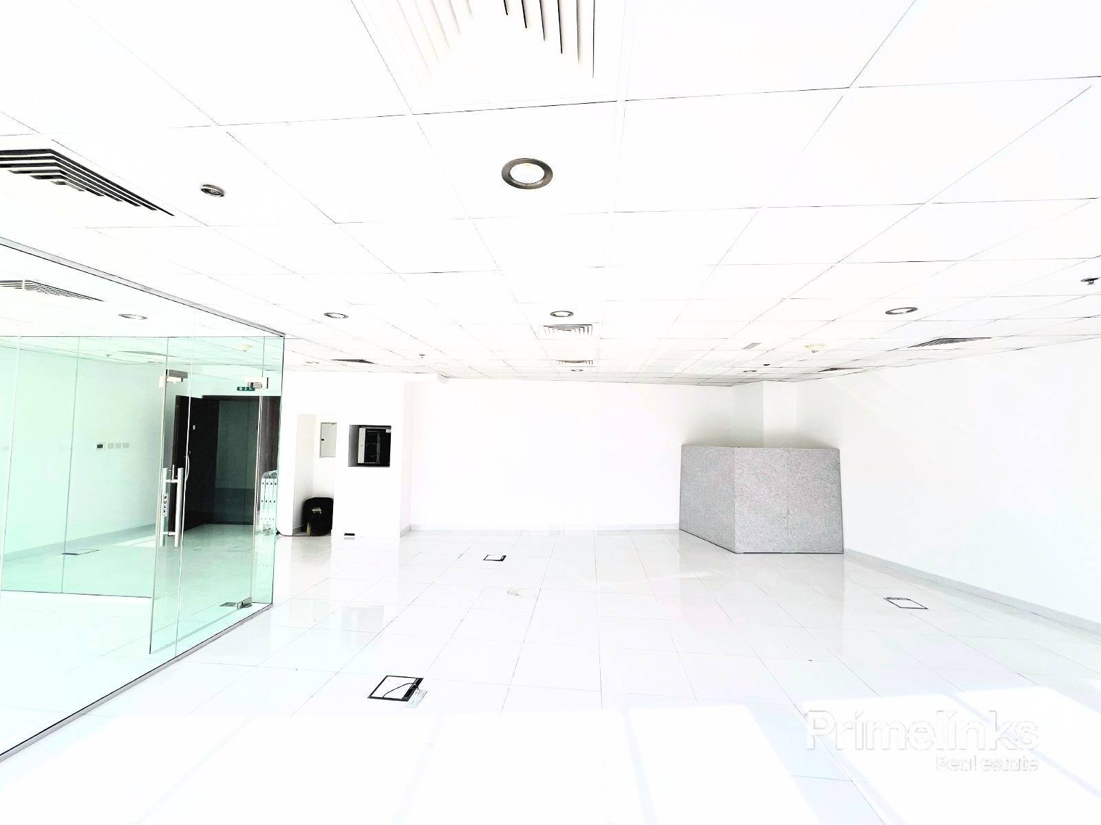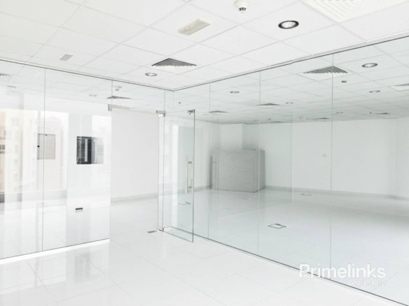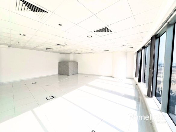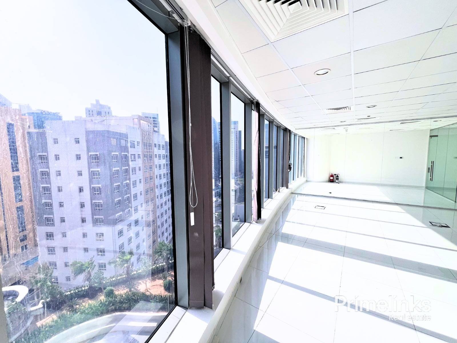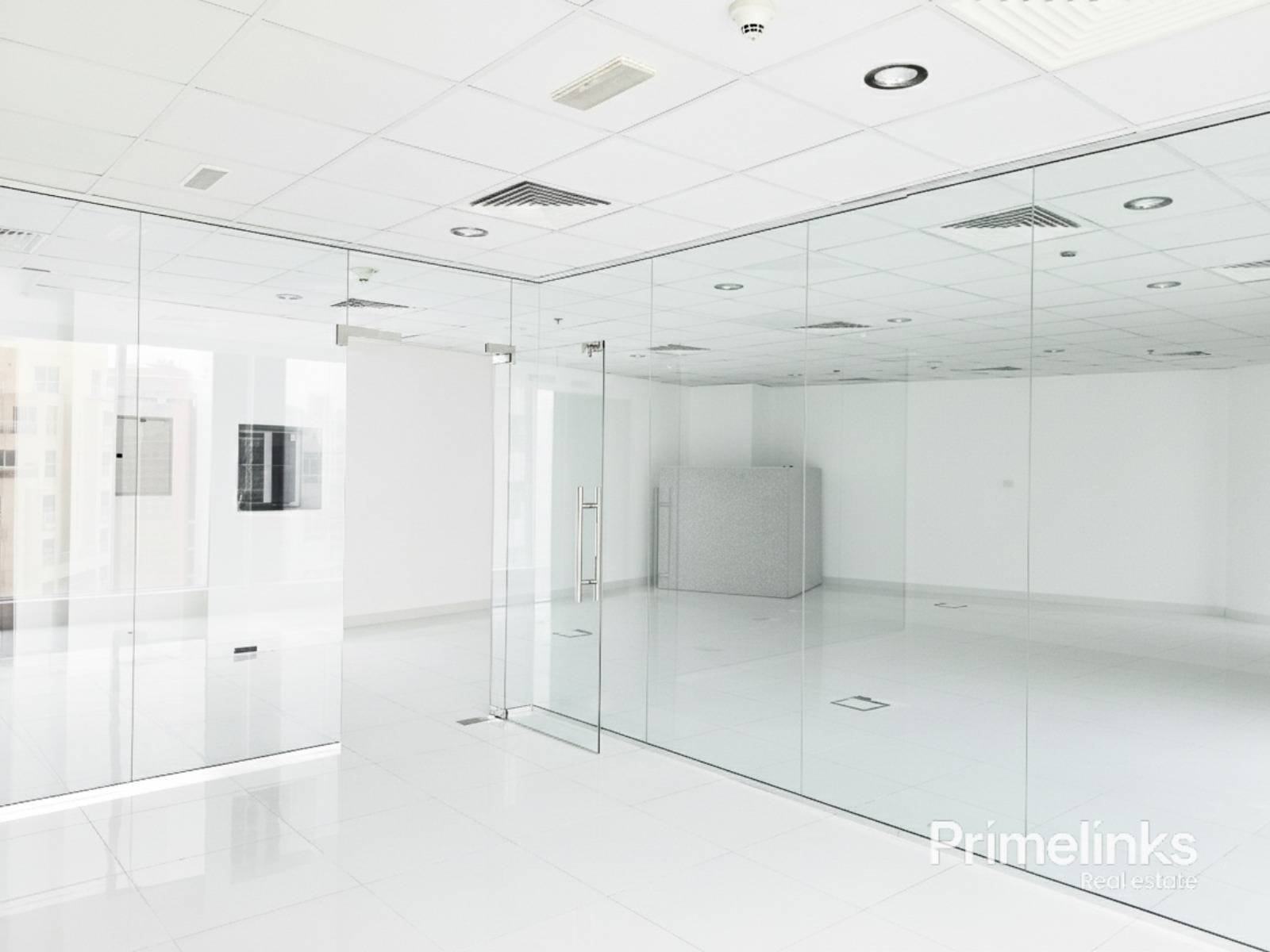 The space benefits from full-height windows, bringing in abundant natural light and enhancing the clean, contemporary atmosphere. Finished with glossy tiled flooring, suspended ceilings, integrated lighting, and central air conditioning, the office is vacant and ready for immediate occupancy.