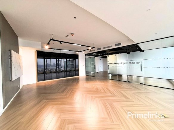 As showcased in the photos, the office is thoughtfully configured into three spacious private rooms, each enclosed with high-quality glass partitions featuring elegant frosted detailing. The layout is designed to maximize natural light while maintaining privacy and a professional atmosphere.Warm wood-finish flooring, clean architectural lines, and a modern ceiling with integrated lighting and AC vents enhance the executive appeal of the space.