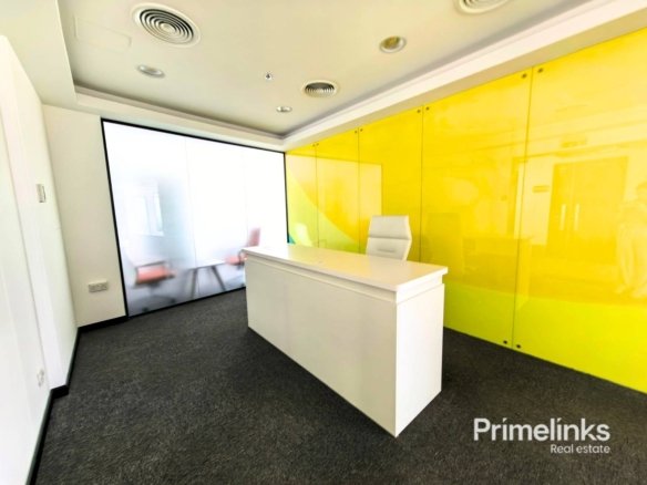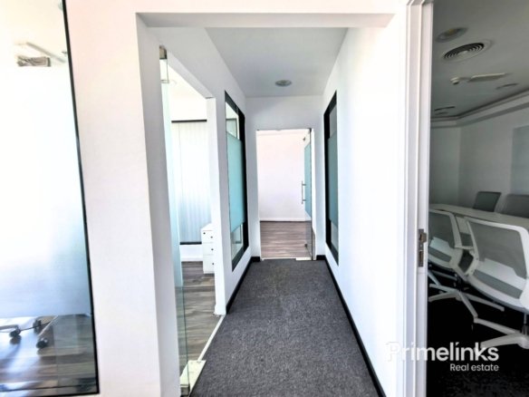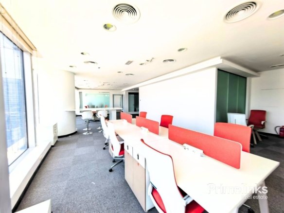The workspace is fitted with contemporary finishes, including clean architectural lines, a modern ceiling with integrated lighting and air-conditioning, and a professional layout that balances openness with privacy. The long collaborative workstations further enhance team efficiency, making it perfect for dynamic businesses.